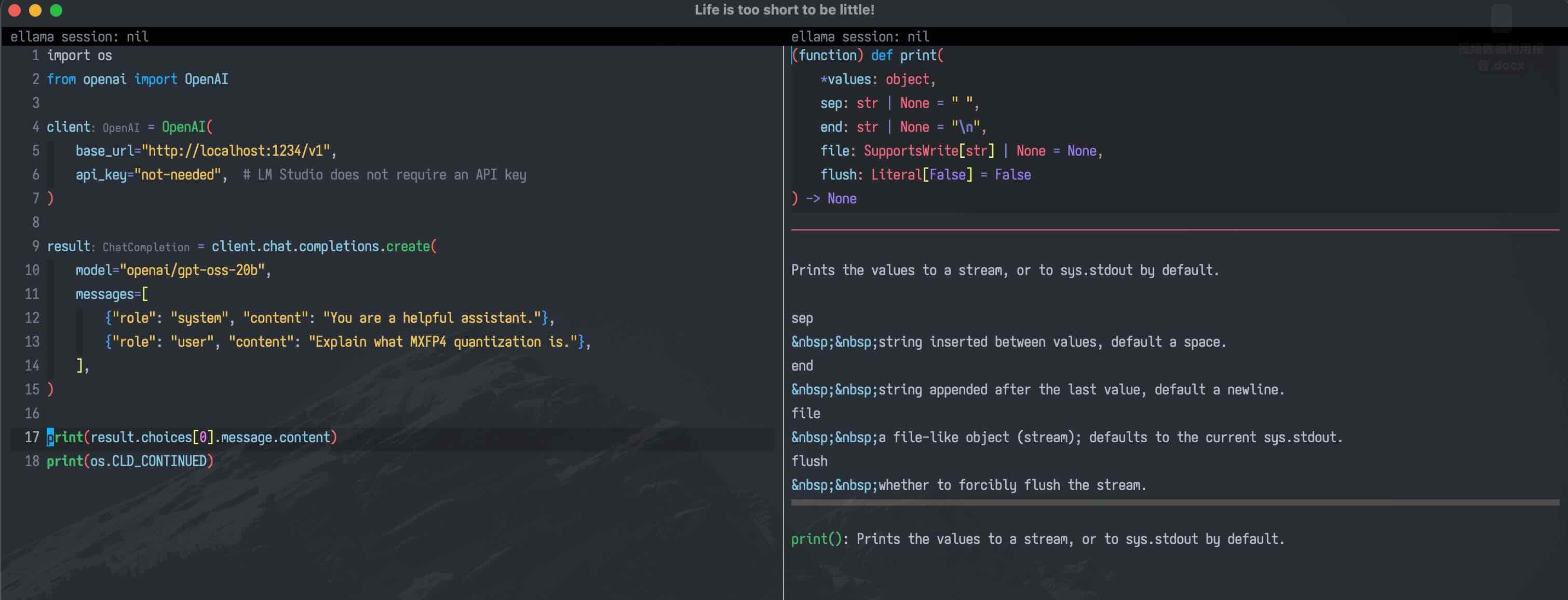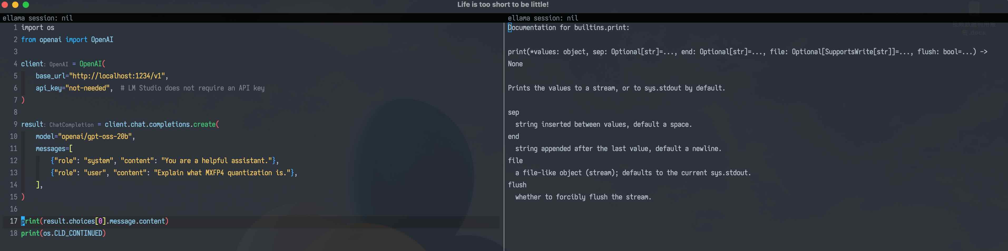 这样,我们只需在 Emacs 里设置一个客户端,用来对接外部的 python 语言服务器程序,充分利用服务器的所有功能即可。